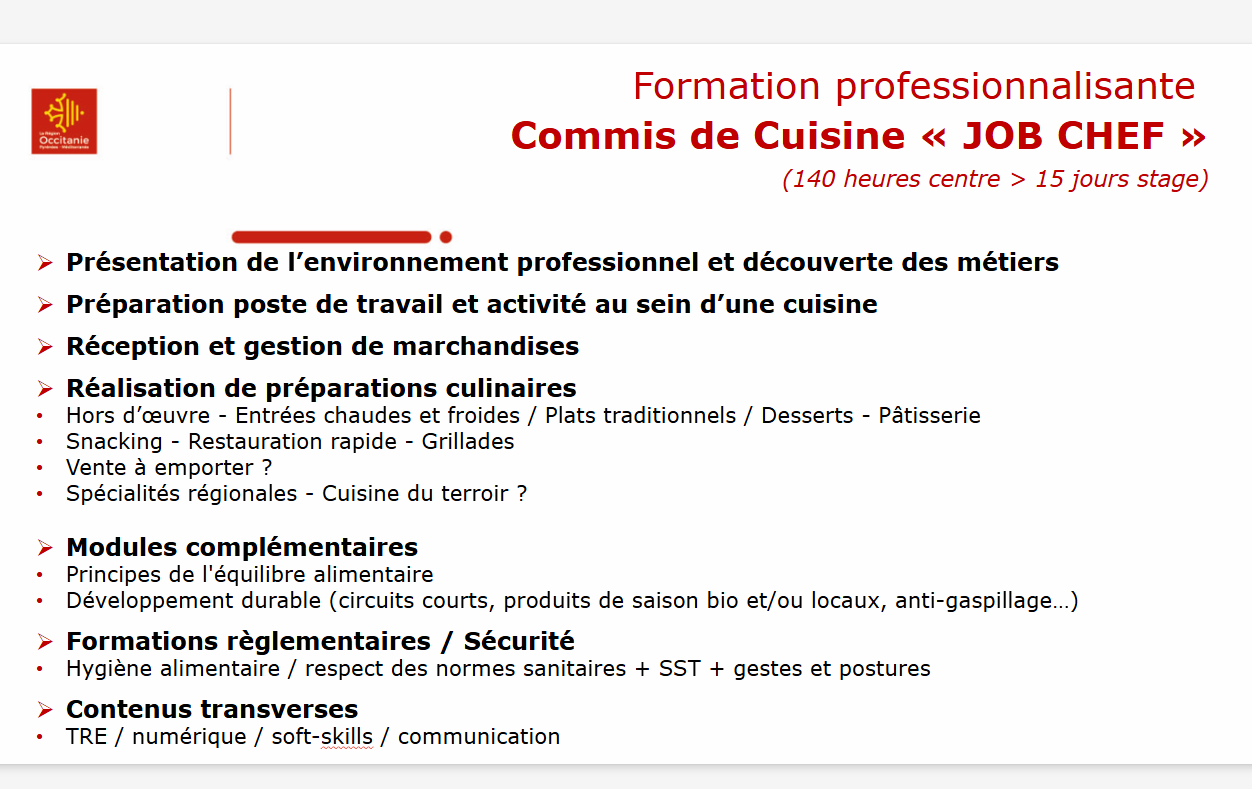 Au-delà du concours, l’objectif est avant tout d’offrir une réelle opportunité d’emploi. Ainsi, tous les participants bénéficieront d’une formation professionnalisante de six semaines pour devenir commis de cuisine, une étape importante vers une insertion professionnelle réussie.