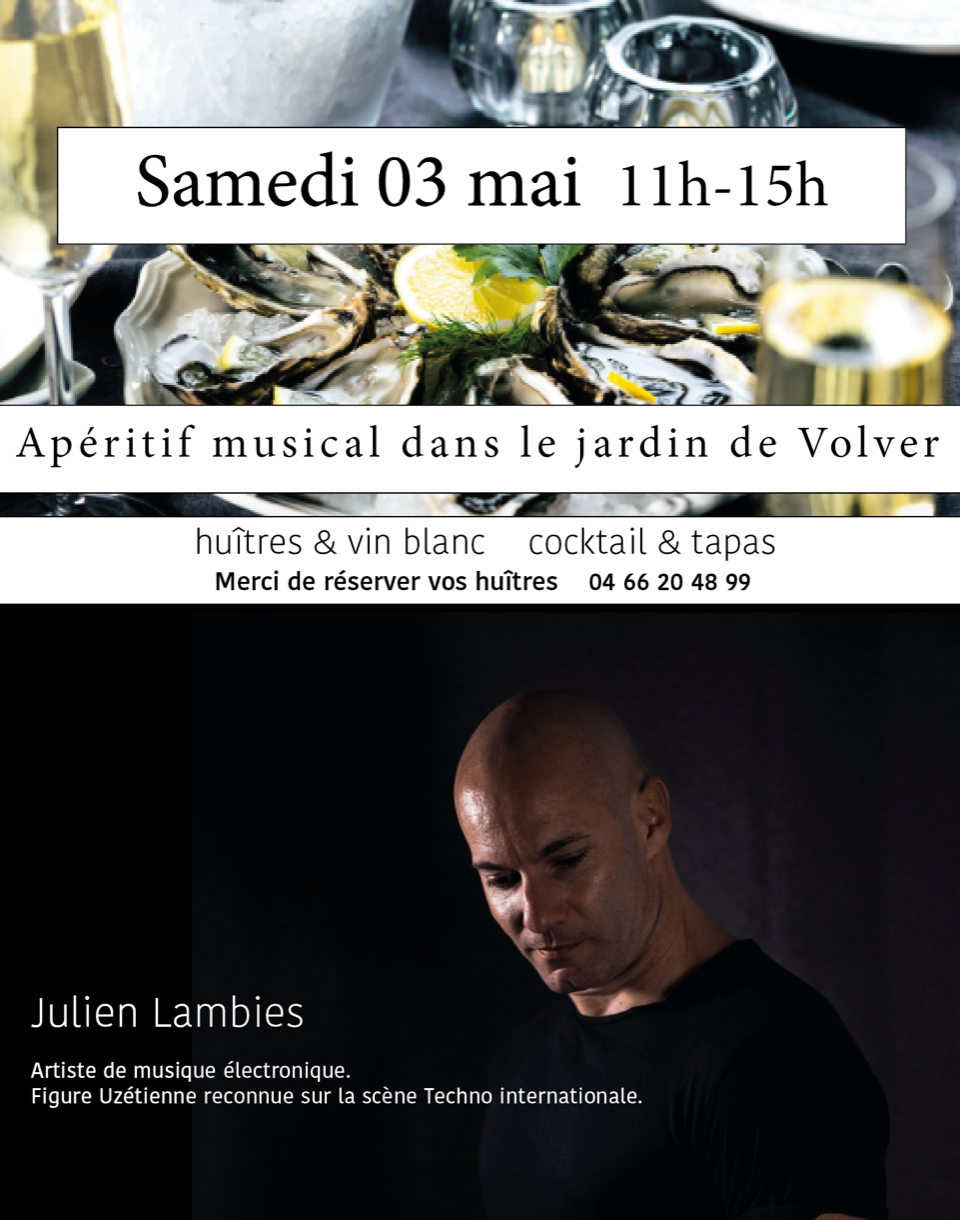 dégustation d’huitres fraiches de chez Emmeline et Quentin, ostréiculteurs passionnés de l’étant de Thau. Dans une ambiance lounge, chic et décontractée, à l’ombre des arbres et de la pergola laissez-vous porter par un DJ international, spécialement invité.