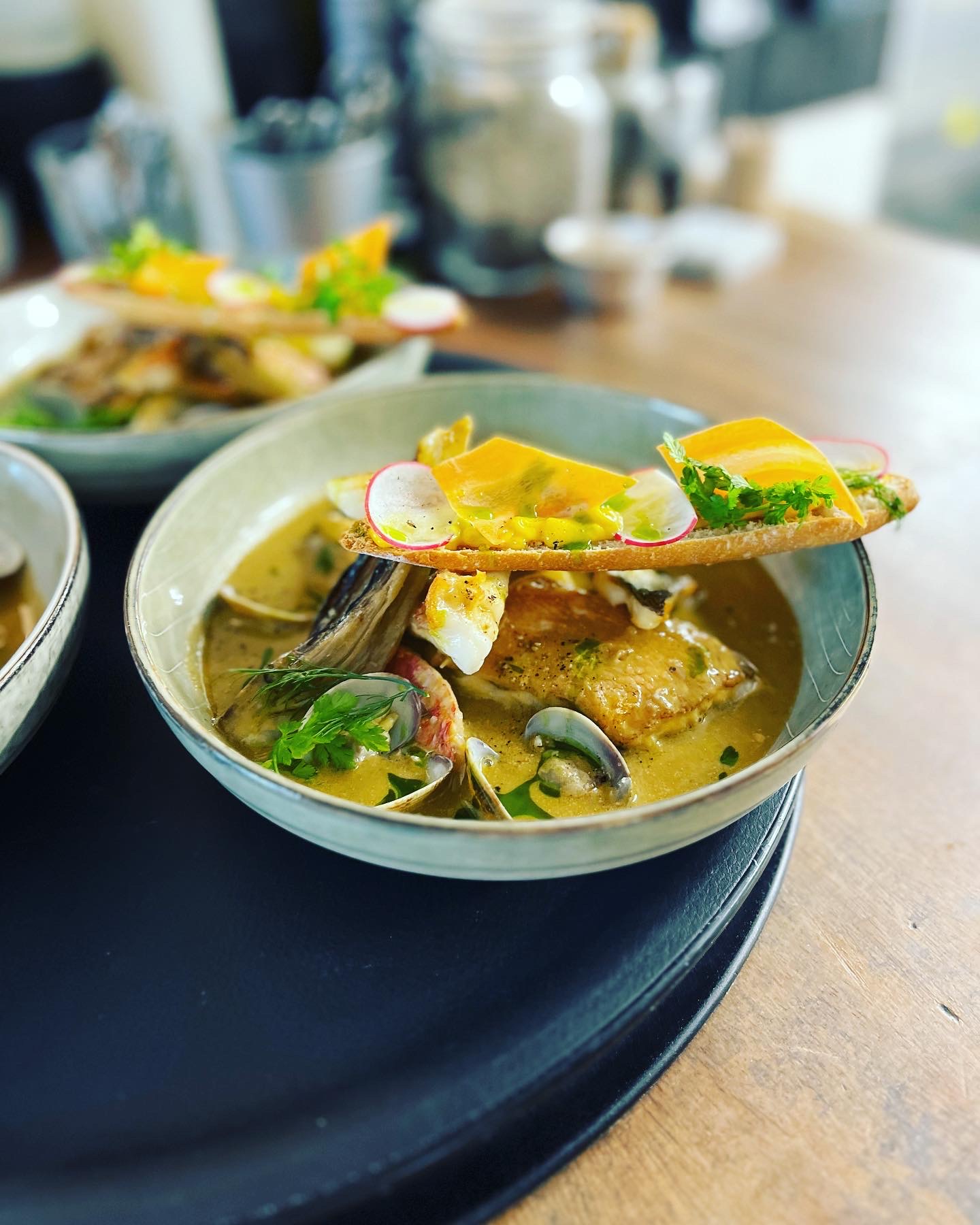 Nous avons choisi ce plat pour son histoire, pour sa saveur, mais aussi pour sa force fédératrice. Autour d’une généreuse marmite, on ne peut qu’être soudé. On partage, on déguste, on s’écoute, on se découvre. La Bouillabaisse n’est pas seulement un mets : c’est un moment de communion, comme une invitation au voyage au bord de la Méditerranée. Et c’est cette invitation que nous souhaitons vous faire, avec la complicité de produits frais et de quelques touches de modernité bien senties.